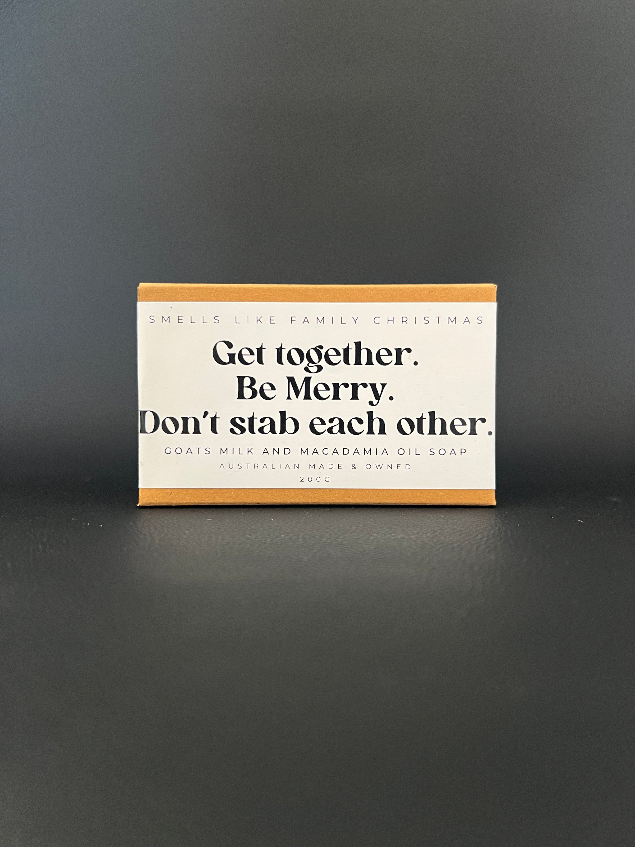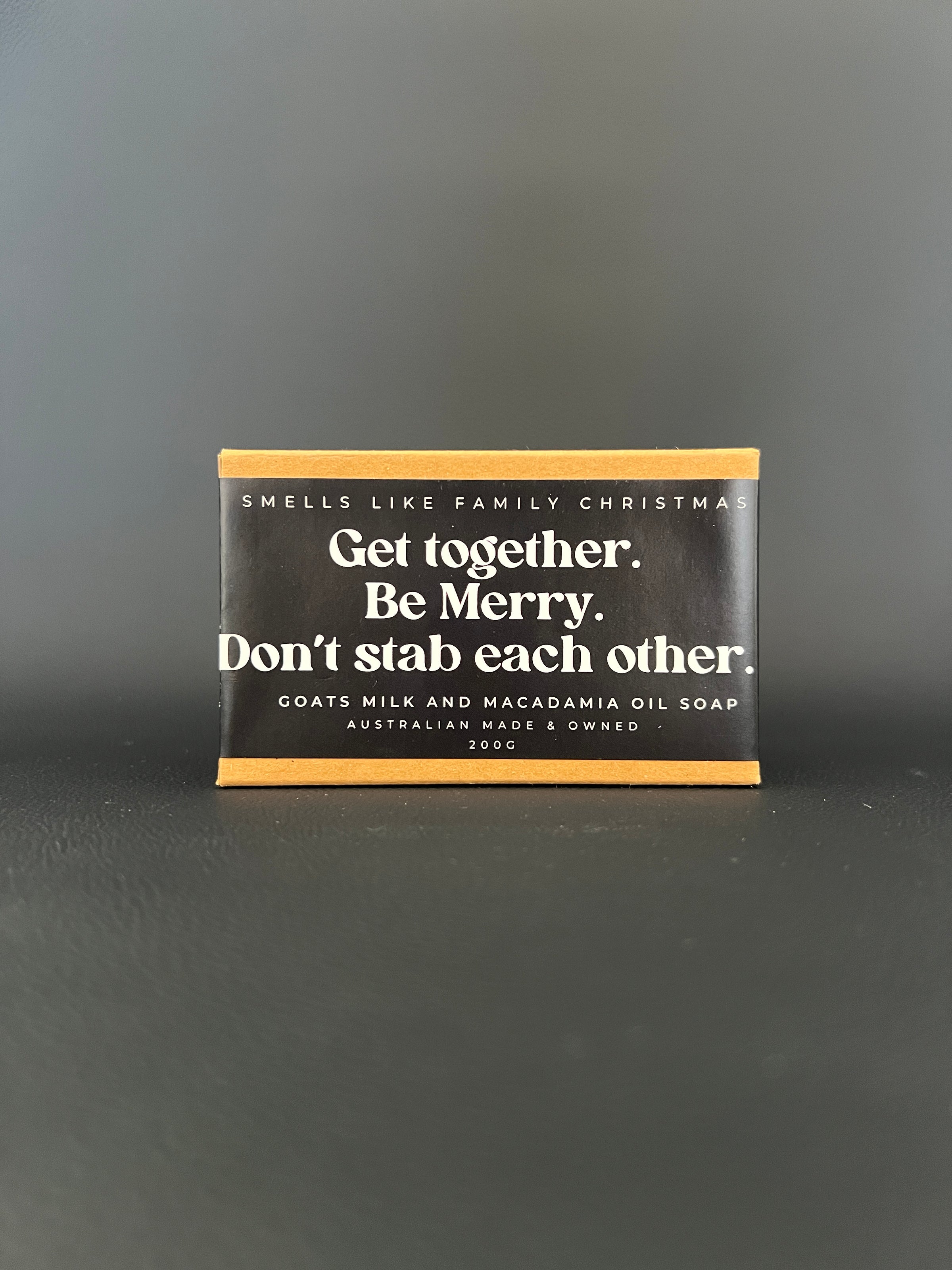 This sassy soap puts a pun in all the chaos that is getting together with family for Christmas. Get together, Be Merry, Don't stab each other! If you can't laugh you might just cry.